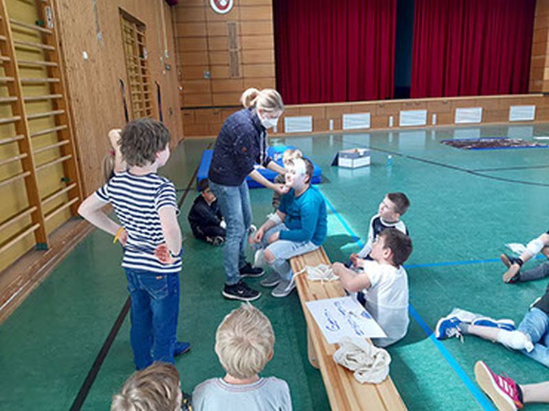 Anschließend ging es zum Verbändeanlegen. Frau Lindenthal erklärte, wie man die verschiedenen Körperstellen verbindet und zeigte uns einige hilfreiche Pflastertricks. Natürlich durften auch hier die Kinder ausprobieren und schnell hatten wir nach Mumien ausschauende Zebras.