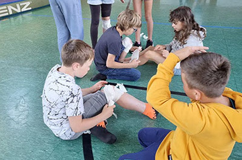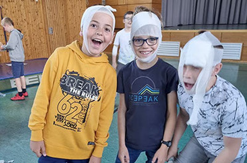 Danach haben wir praktische Übungen gemacht. Zuerst haben wir gelernt richtig Pflaster anzubringen. Das ist am Daumen und am Ellenbogen gar nicht so einfach. Die müssen an der Klebestelle richtig eingeschnitten werden, erst dann halten sie richtig. Vor dem Pflaster anlegen, muss man die Wunde richtig desinfizieren. Ist die Wunde zu groß, muss ein Verband angelegt werden. Dies haben wir praktisch am Knie, Ellenbogen und Kopf geübt. Falls ein Verletzter bewusstlos ist, muss er