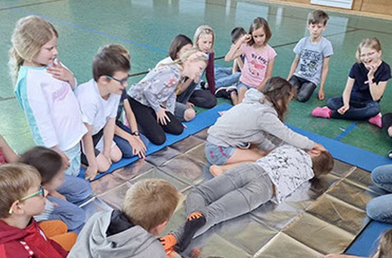 Im nächsten Teil zeigte Frau Lindenthal, wie man die stabile Seitenlage durchführt. Diese ist dann wichtig, wenn eine Person bewusstlos aufgefunden wird. Um die Atemwege freizuhalten, ist der Mund des Betroffenen der tiefste Punkt des Körpers. Die Zebras übten die stabile Seitenlage mehrmals mit großer Begeisterung.