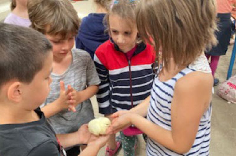 Anhand von verschiedenen, den Kindern vertrauten Lebensmitteln, wurde das Gewicht eines Kükens zum ausgewachsenen Masthähnchen demonstriert. Anfangs wog das Küken 40 g, so viel wie 2 kleine Tüten Gummibärchen, nach 21 Tagen so viel wie eine große Packung Mehl. Nachdem die Kinder die zahlreichen Küken im Stall besucht hatten, durften sie als krönenden
