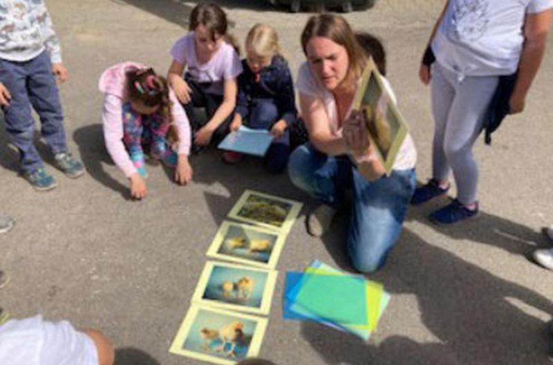 Bei strahlendem Sonnenschein marschierten die Kinder singend durch Horrheim und über die Felder zum Nachbarort. Da Wandern hungrig macht, wurde nach Ankunft zuerst gevespert. Danach wurde von Melanie Grau mit viel Geduld und pädagogischem Geschick Wissen zum Thema “Vom Ei zum Huhn“. vermittelt und Schülerinnen und Schüler bekamen Antworten auf all ihre Fragen.