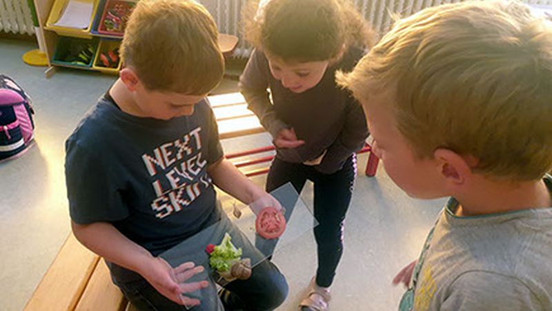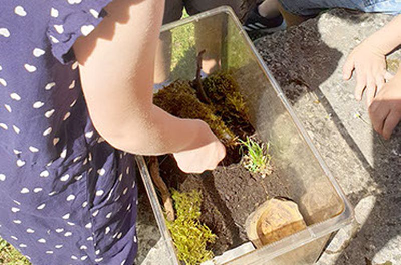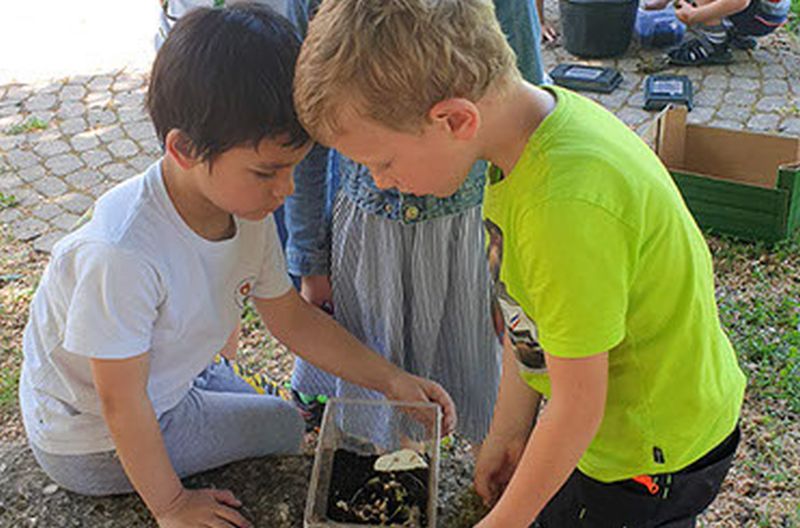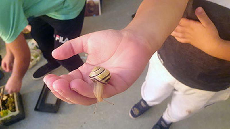 Weinbergschnecken, Hainbänder- und Gartenbänderschnecken durften in die Terrarien einziehen. Die Schnecken wurden zuverlässig gehegt, gepflegt, gefüttert und mit Sprühflaschen mit Wasser angefeuchtet. Anfängliche Berührungsängste wurden von den meisten Kindern schnell abgebaut und so durften die Schnecken ihre Schleimspuren an Händen und Armen