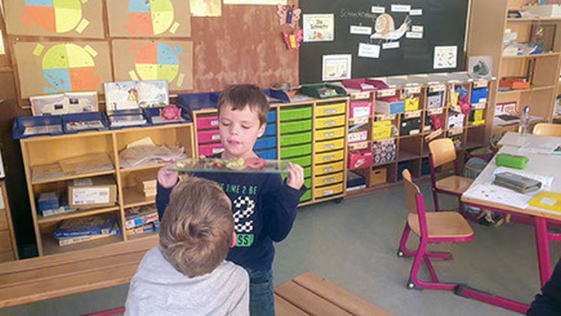 In den Wochen vor Pfingsten beschäftigten sich unsere beiden ersten Klassen ausführlich mit dem Thema Schnecken. Zum Auftakt wurden Regeln zum Umgang mit Lebewesen besprochen. Danach wurden in Gruppen Schneckenterrarien artgerecht eingerichtet. Jedes Kind durfte eine Gehäuseschnecke mitbringen, womit die Schülerinnen und Schüler regelrecht ins Schneckenfieber verfielen.
