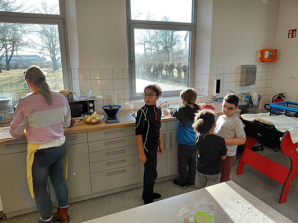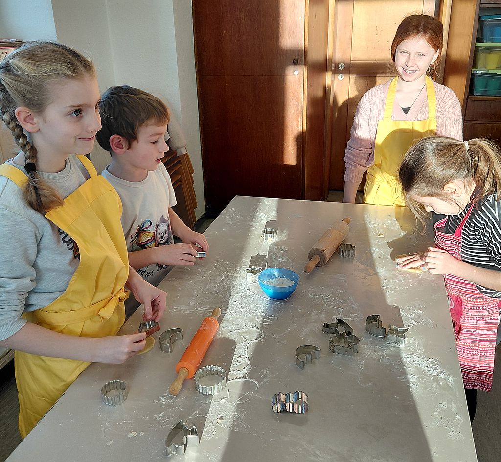 Dank vieler Teigspenden der Eltern flitzen die Kinder mit ihren Patinnen und Paten in die Küche, waschen ihre Hände und schnüren Schürzen zu. Dann werden bunte Streusel in den Teig geknetet, ausgerollt und ein Plätzchen nach dem nächsten auf das Blech gebracht. Tannenbäume, Sterne oder Herzen, groß oder klein, dick oder dünn, am Ende sind es um die 20 Bleche, die der Backofen schaffen muss.
