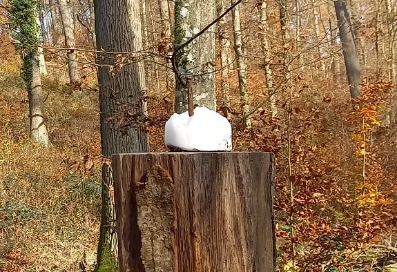 Es war auch noch etwas Schwarzes am Baum, an dem die Wildschweine sich kratzen und ein Leckstein auf einem Baumstamm befestigt. Wenn es regnet, läuft das Salzwasser herunter und die Tiere lecken es auf.