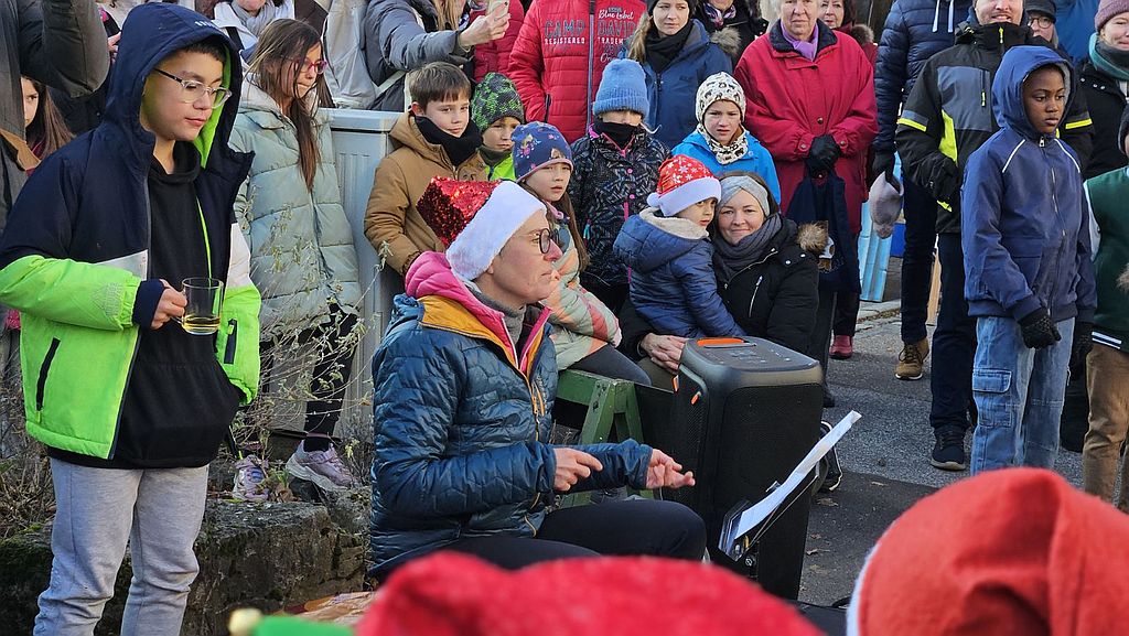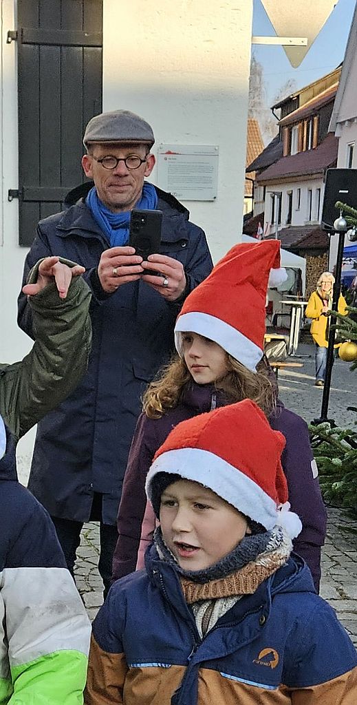 Der Chor sang einige fetzige Lieder unter der Leitung von Sonja Thalheimer. Bei strahlendem Sonnenschein und frostigen Temperaturen sorgte die Darbietung für Begeisterung im Publikum und für gute Stimmung. Zwischendurch begrüßte Ortsvorsteher Müller die Gäste und auch der Oberbürgermeister kam auf einen kurzen Besuch vorbei.